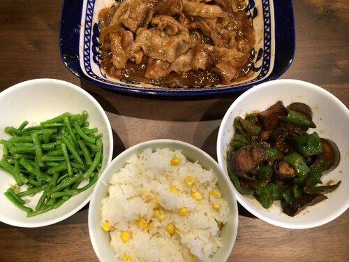 休日は自分が作らないのでブランクかあります。 今日はなんとなく買い物にいってなんとなくつくりはじめてしまい、途中方向修正しようとしたが、中途半端になってしまった料理です。 豚肉の生姜焼き 茄子、ピーマンの鍋シギ 隠元のおひたし トウモロコシご飯…