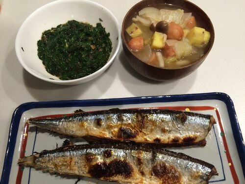 久しぶりの投稿。 サンマもそろそろ食べれなくなりますね。 サンマの塩焼き ソーセージ、玉ねぎ、じゃがいも、さつまいも、白菜のポトフ モロヘイヤ、梅肉のおひたし